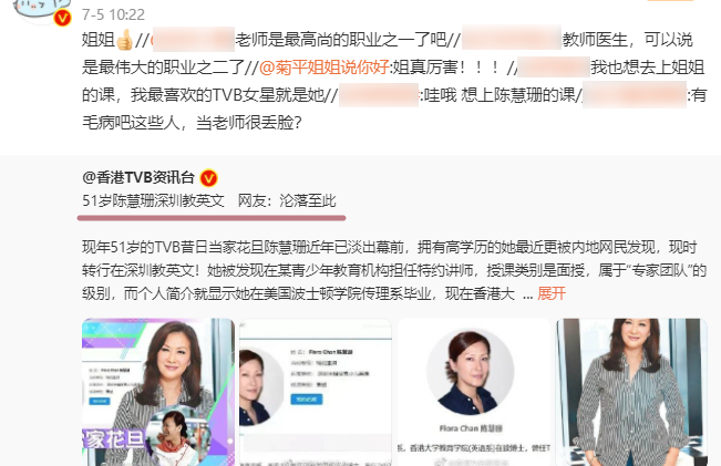 就比如陈慧珊,曾是 TVB 四大花旦之一的她,被网友扒出现已转行在机构当起了英文老师。