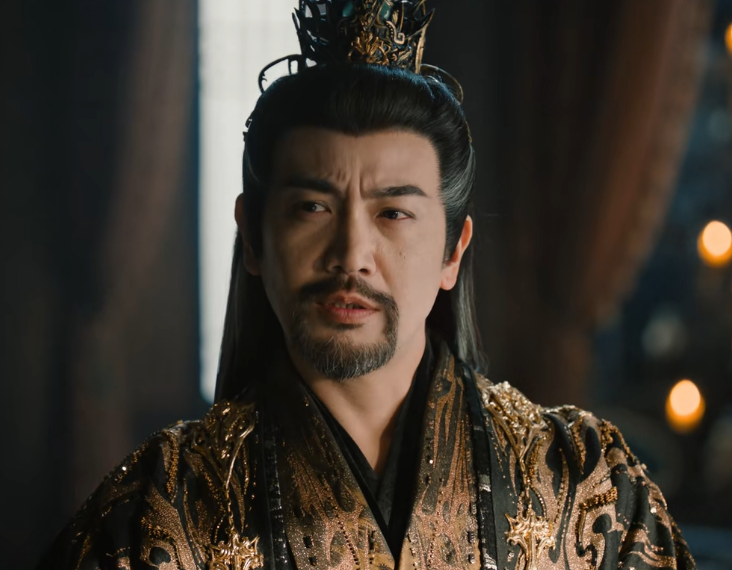 他饰演了男主的父亲,王权弘业,一身黑金长袍,横眉冷对,气势迫人。