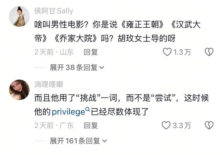 “为什么会有‘挑战一部男性电影’这种疑问?”有网友回答道:“本质原因之一,还是女性创作者还是太少了。”