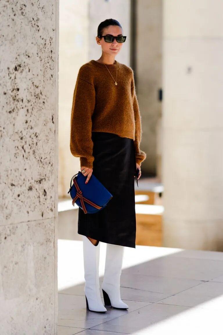 半身裙以稍微过靴头一点的长度更好看,要不然裙摆跟靴头接近,很容易把腿部分成两截。