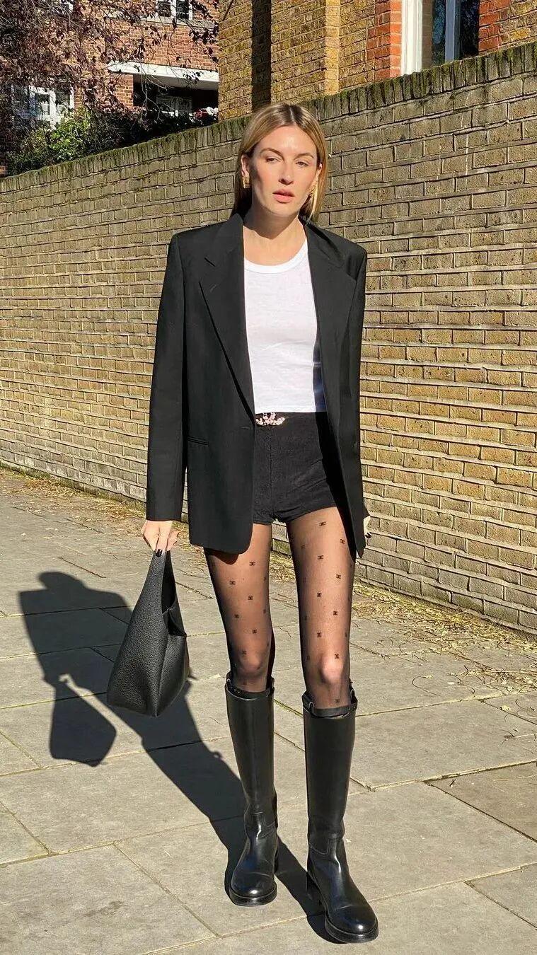 首选紧身打底裤,特别是跟黑色高筒靴+长大衣的组合,即便是小个子也能塑造很利落飒气的长腿效果。
