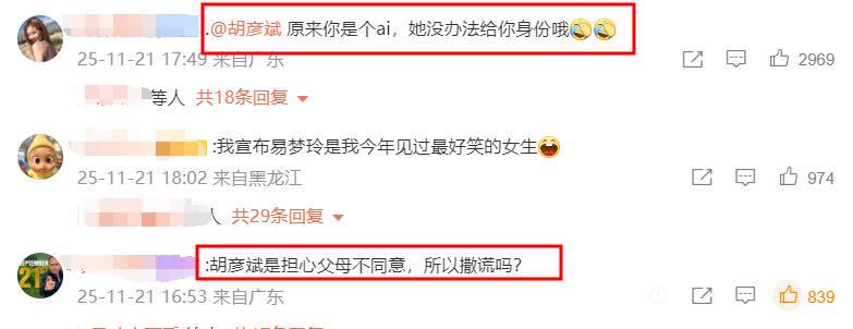 还有网友调侃胡彦斌,说他是AI,易梦玲不给他名分。