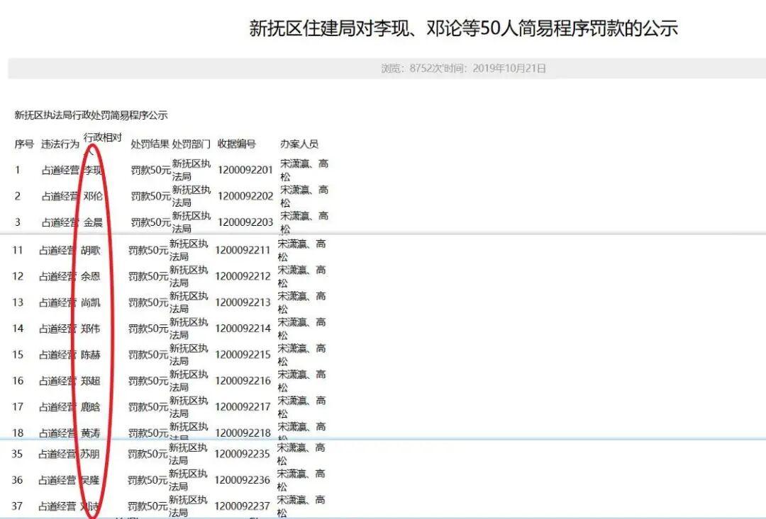 “孙俪”“鹿晗”“杨颖”“金晨”“董璇”“胡歌”……网友发现,这些名字竟然出现在辽宁抚顺新抚区的占道经营处罚名单上。