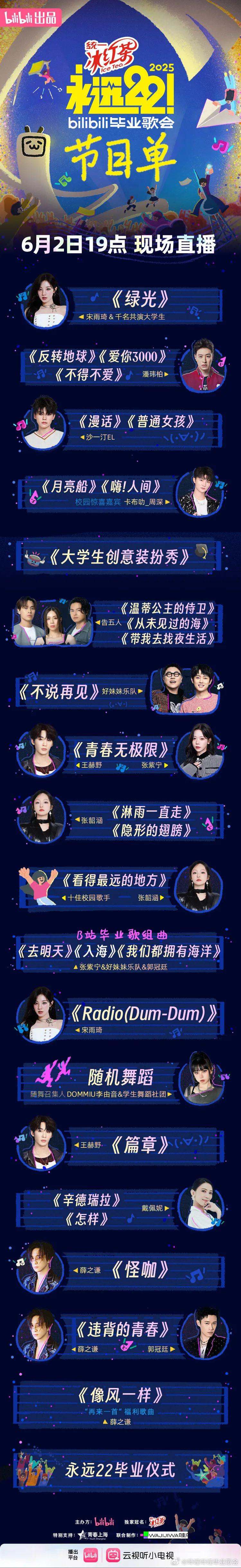 《永远22!2025bilibili毕业歌会》今日(6月2日)19:00在哔哩哔哩直播区(B站)现场直播。本次歌会将线下、线上同步直播零延时互动。节目单释出。