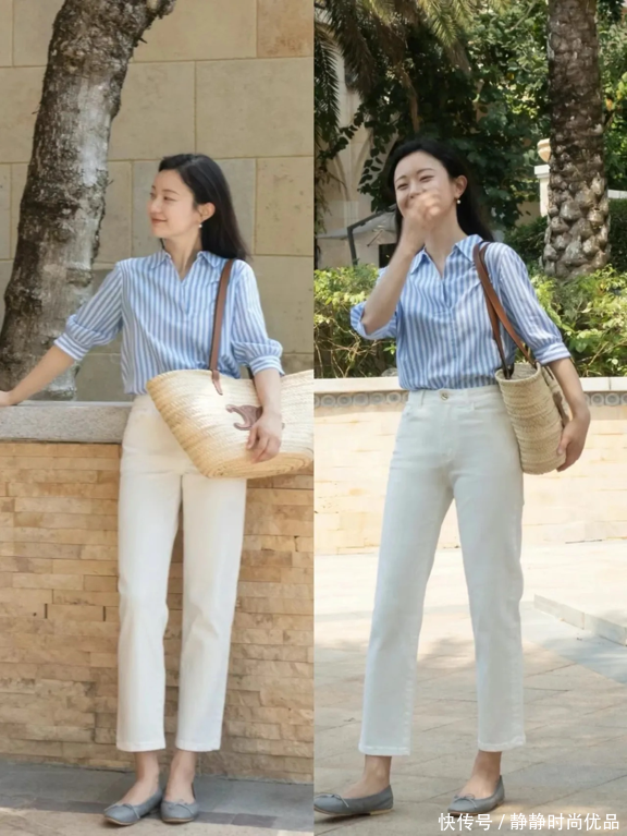 尤其是竖条纹的衬衫,对于身材比例的拉伸效果特别好,适合微胖的女性朋友。