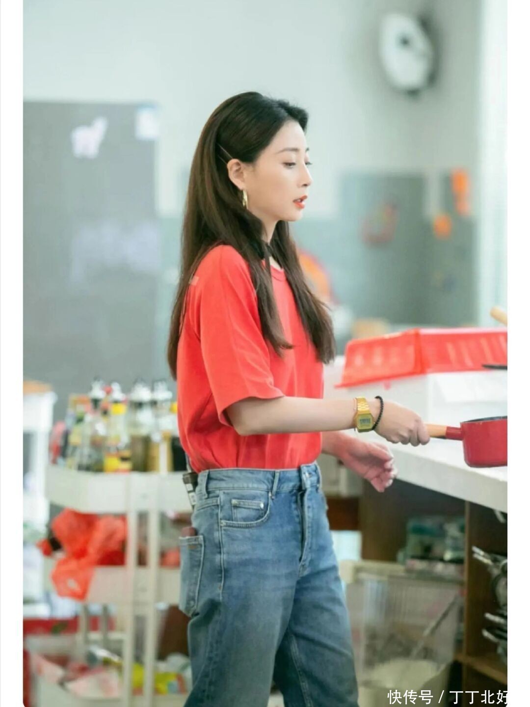 再看看殷桃身上穿的红色T恤,张扬靓丽的色彩,极具视觉冲击力,无论走到哪里,都能成为不可忽视的存在。