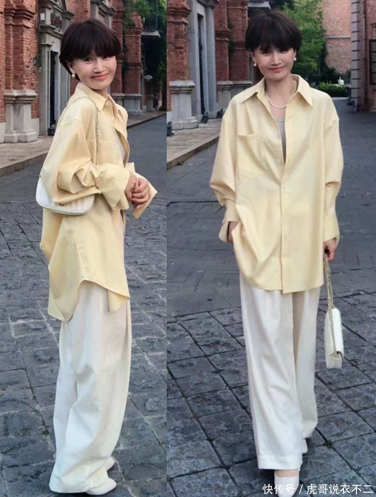 衬衫的配色一般不会很单一,而到了夏天的话,不妨试试具有代表性的色调之一,浅黄色,衬衫结合出了十分清新淡雅的魅力,看上去不会有高饱和度色彩带来的冲击感,因此在简单的搭配下,也可以令人轻松解锁时尚又松弛的初夏穿搭。