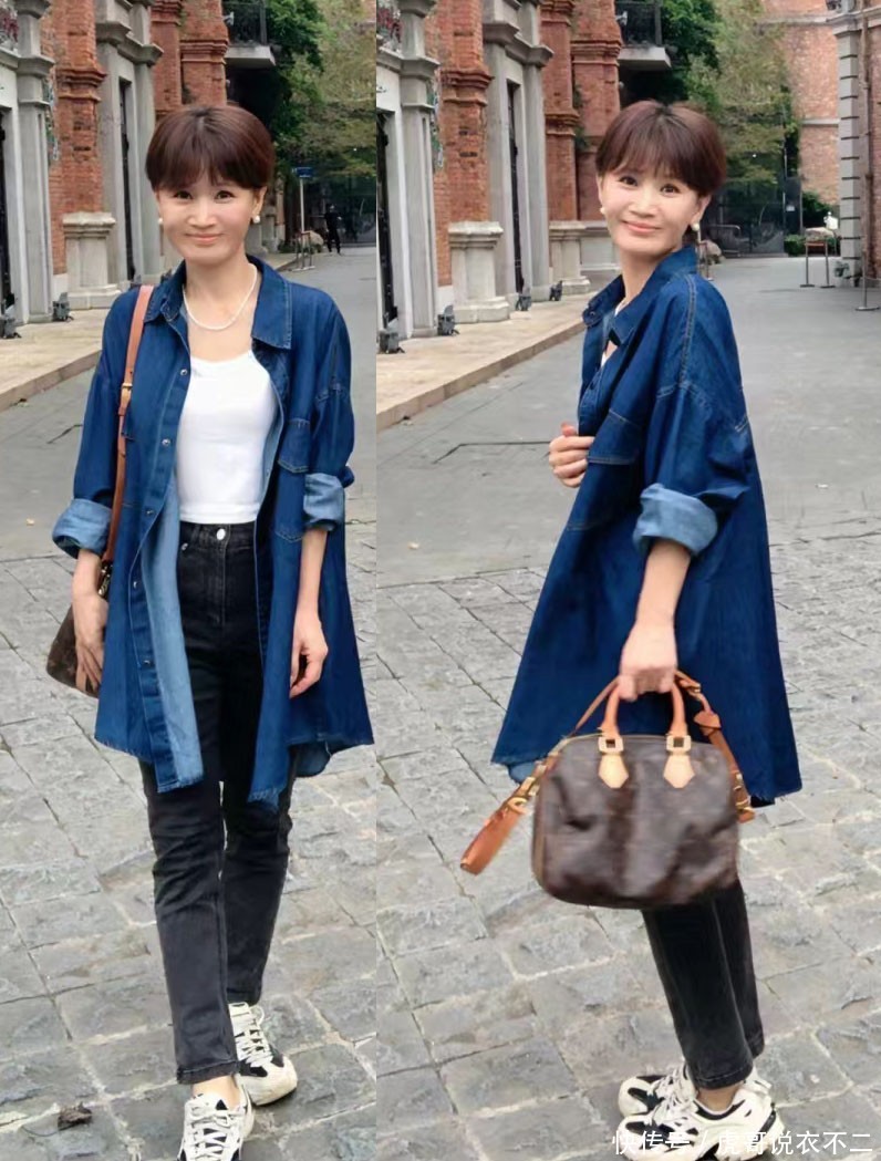 但是对于40多岁的女人来说,并不推荐选用紧身牛仔裤,在视觉上构造出的紧绷感,既挑腿型、又不显大气,不妨试试直筒或是阔腿样式,包容感更强。