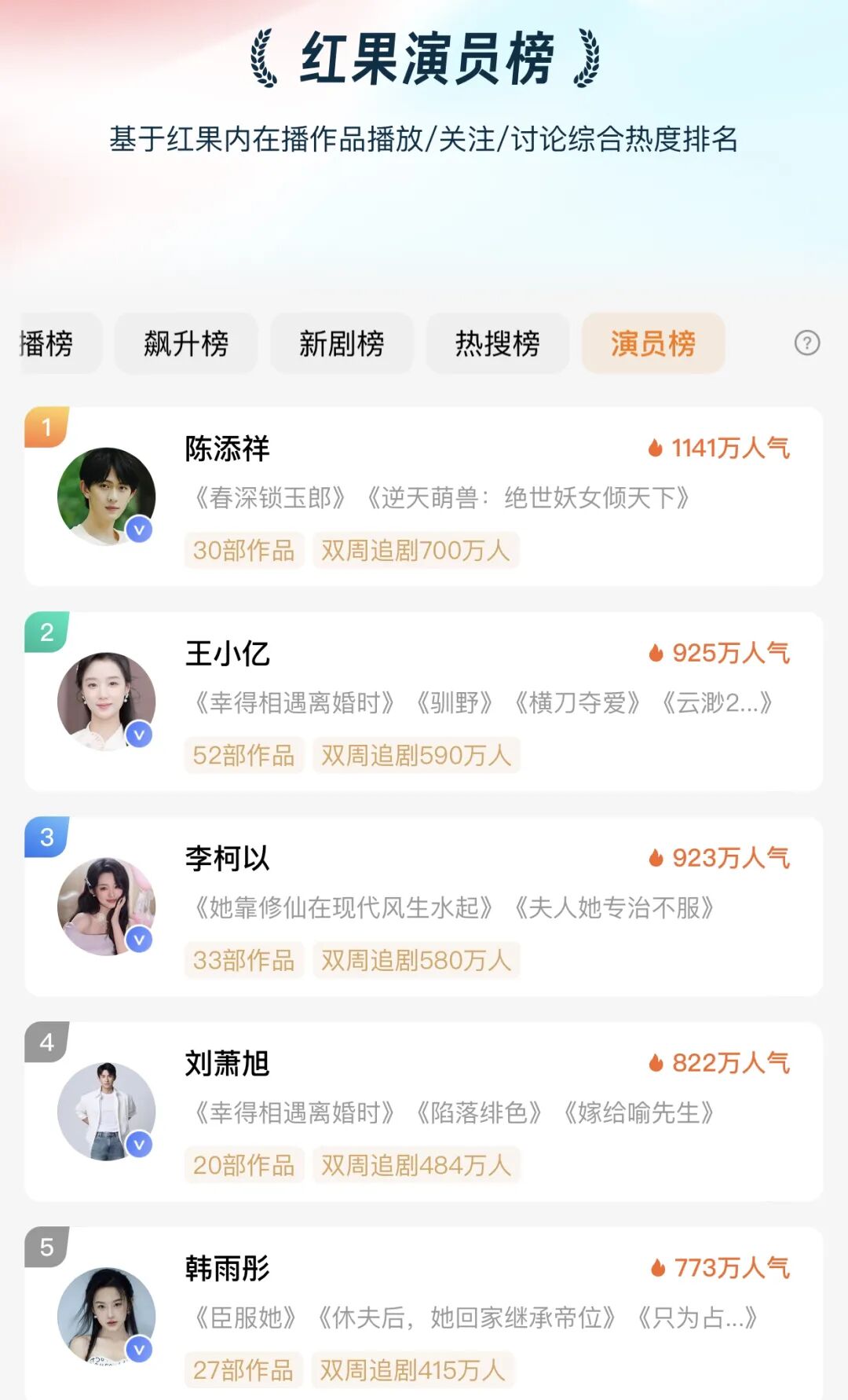 现居红果演员榜TOP3的陈添祥、王小亿、李柯以,在红果站内皆拥有百万级别的粉丝量,其中陈添祥双周追剧人数高达700万,王小亿与李柯以的获赞量更双双逼近亿级,对用户的吸附力可见一斑。