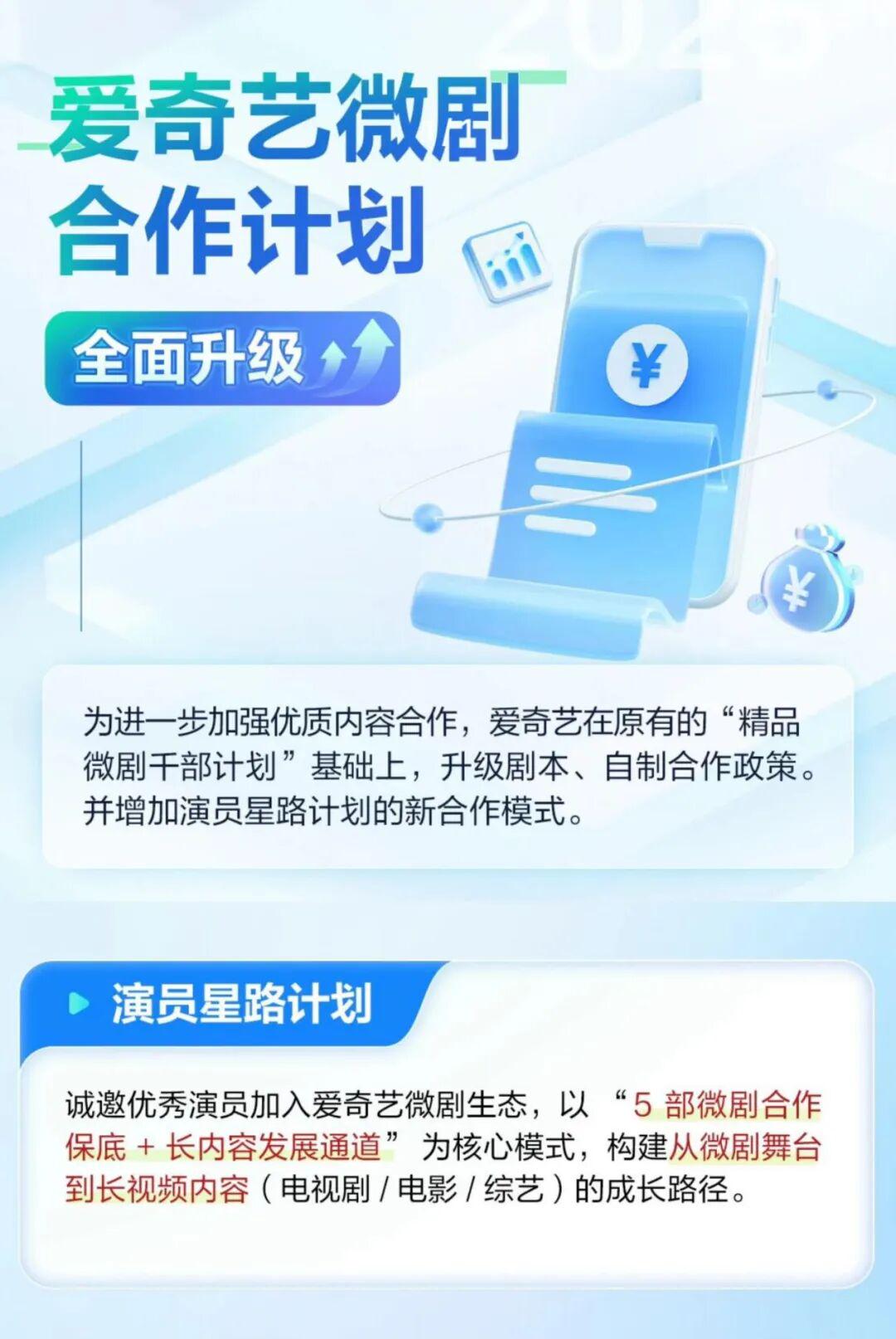 与红果自制官宣推出“演员合作计划”仅一周之隔,爱奇艺在平台全新升级的微剧激励政策中也新增了一条面向短剧演员的“招贤令”——“演员星路计划”,而且同样开出了十分具有诱惑力的条件,即为优秀微剧演员搭建从微短剧舞台到长视频内容(电视剧/电影/综艺)的成长通道。