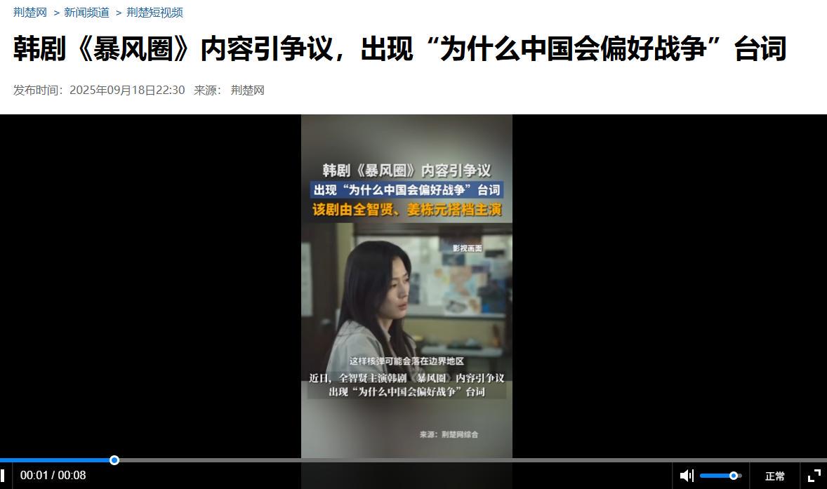 信源来源:2025年09月18日 荆楚网 韩剧《暴风圈》内容引争议,出现“为什么中国会偏好战争”台词