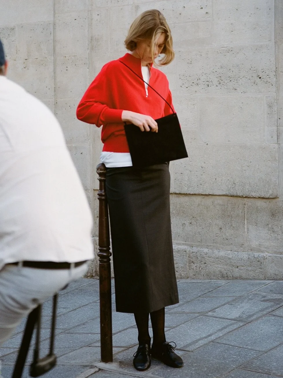 直筒裙线条利落,非常适合职场穿搭。