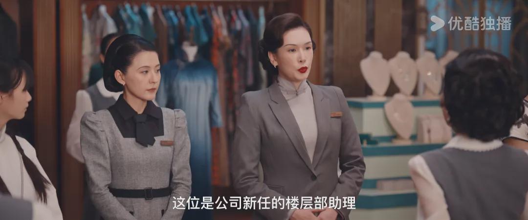 沈部长甫一登场,便自带强大气场,仿佛能掌控整个永新百货的风云变幻。她留着烫过的卷发,身着优雅大方的素色旗袍,外罩一件西装外套,整个人显得既精致又利落,往那里一站,就自带女领导的威严与气场。