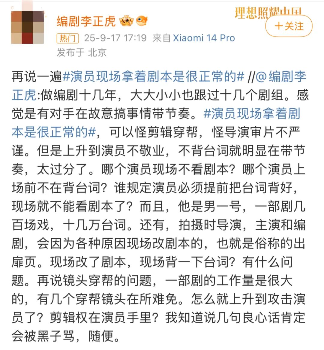 随后就有编剧出来表示,演员手里拿剧本,本来就很正常。
